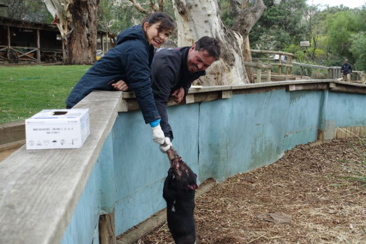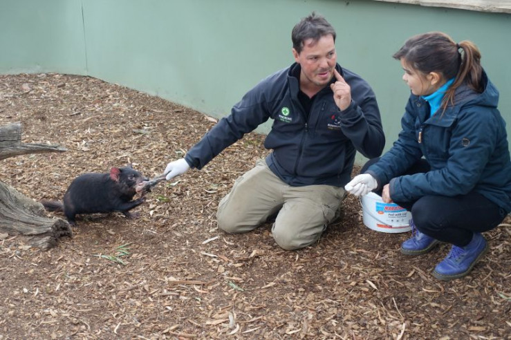Greg, der Leiter des Wildtierparks nimmt Anna mit ins Gehege. Das ist nicht ohne. Beutelteufel sind die größten noch lebenden Raubbeutler. Und sie haben von allen Säugetieren die größte Beißkraft. Sogar Knochen können sie mühelos knacken. Mit welcher Kraft ein Tasmanischer Teufel zubeißen kann, erfährt Anna, als sie ein Tier füttern darf. Die Keule, die sie ihm hinhält, kann sie nur mit Mühe halten, so stark zerrt der Teufel daran.