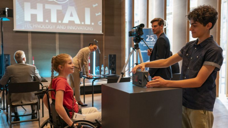 Beim Jugendwettbewerb stellen Pippa (Elyza) und Tarun (Caspar) ihre bahnbrechende Erfindung vor.