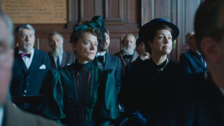 Die Frauenrechtlerinnen Cölestine Truxa (l., Alexandra Maria Timmel) und Else Jerusalem (r., Barbara Bohaczek) sind die einzigen Frauen im Publikum beim Prozess gegen Bordellchefin Regine Riehl.