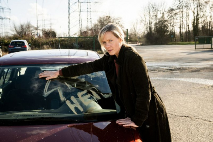 Claudia Voss (Anna Schudt) wischt wütend ihre Windschutzscheibe frei, die mit "SIEG HEIL" beschmiert worden ist.