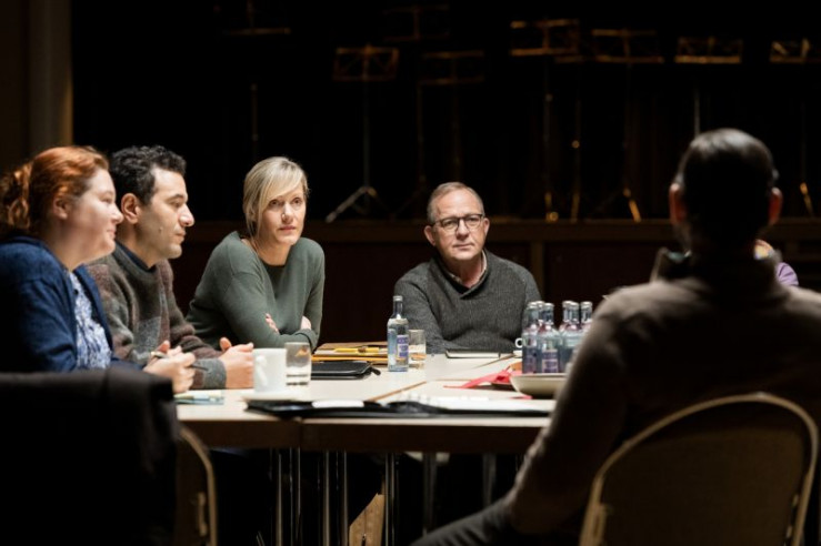 Im Ortsbeirat diskutieren Pfarrerin Wenz (Nadja Zwanziger, l.), Dr. Erdem (Mohamed Achour, 2.v.l.), Claudia Voss (Anna Schudt, M.) und Gerhard Zöllner (Uwe Preuss, 2.v.r.) mit Veith Landauer (Alexander Beyer, r.) über die geplante Flüchtlingsunterkunft.