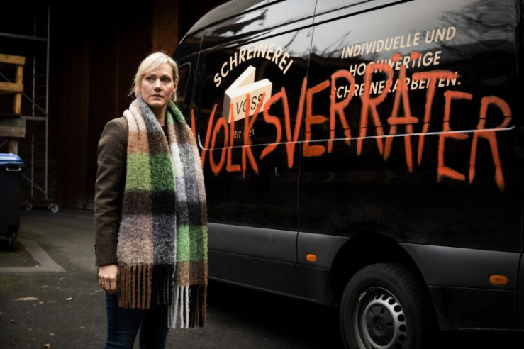Claudia Voss (Anna Schudt) steht fassungslos vor einem beschmierten Transporter der Familien-Schreinerei.