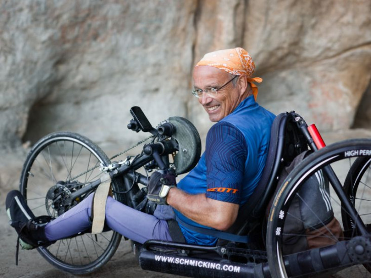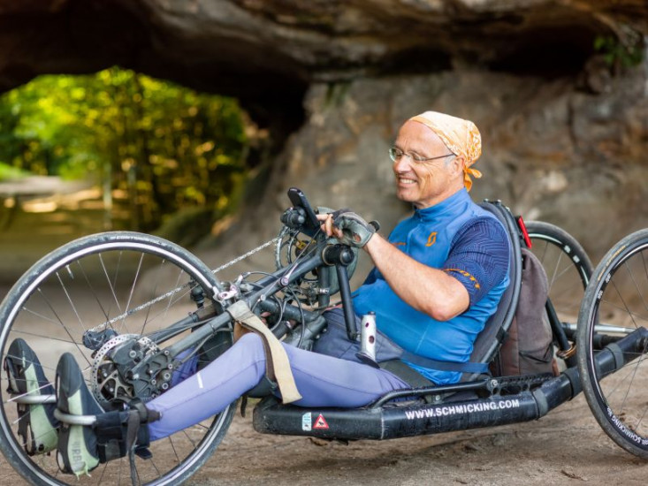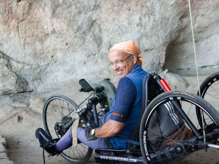 Veit Riffer (58) ist seit einem Kletterunfall vor knapp 30 Jahren querschnittsgelähmt. Heute erobert er seine "Felsenheimat" Sächsische Schweiz mit dem Handbike und testet Handbike- und Rolliwanderstrecken für andere Rollstuhlfahrer.