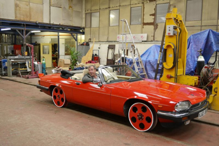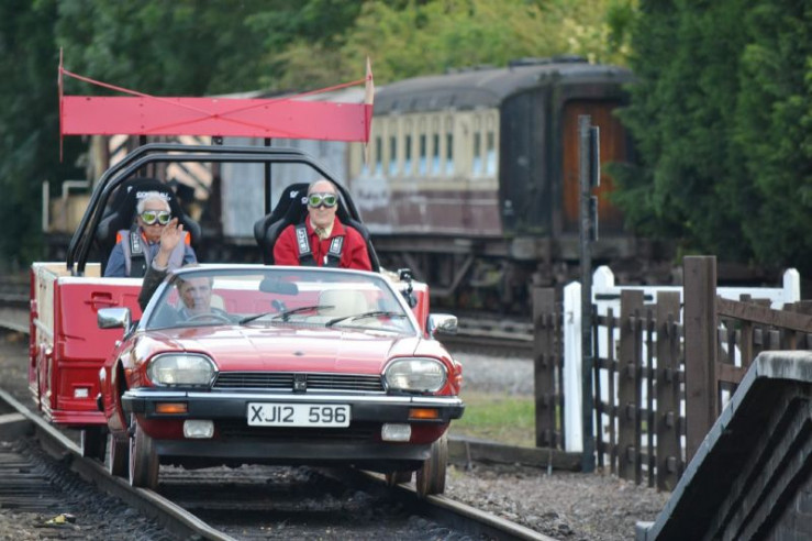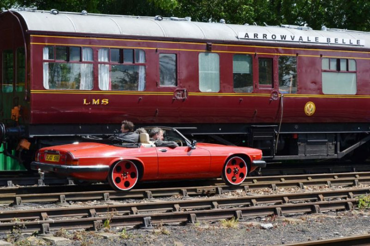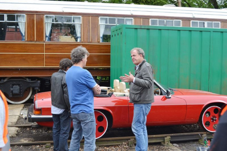 Jeremy Clarkson (vorne) testet mit zwei Redakteuren eines Railway-Magazins, ob der umgebaute Jaguar XJS als Lokomotive taugt. +++ Die Verwendung des sendungsbezogenen Materials ist nur mit dem Hinweis und Verlinkung auf RTL+ gestattet. +++