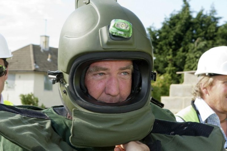Jeremy Clarkson trägt einen Schutzanzug, um sich vor der Explosion zu schützen.