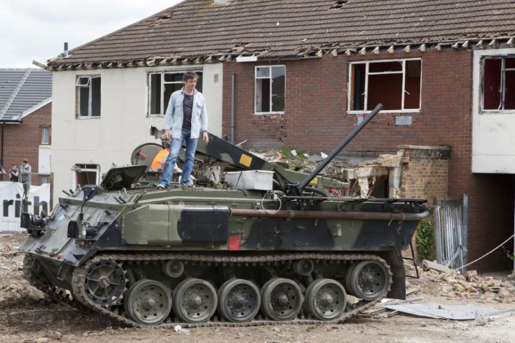James May und seine Kollegen stehen heute vor der Herausforderung, eine Reihe von Häusern abzureißen. Dazu ist ihnen nahezu jedes robuste Gefährt willkommen.