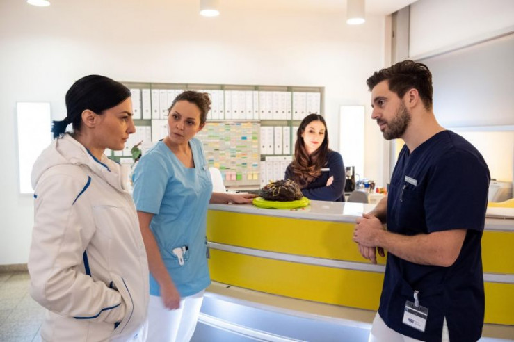 Ella (Ines Quermann), Dr. Sebastian Sander (Oliver Franck), Nora (Mimi Fiedler) und Samira (Sila Sahin-Radlinger) (v.l.) besprechen am Empfang der Notaufnahme die weitere Behandlung der Patienten.
