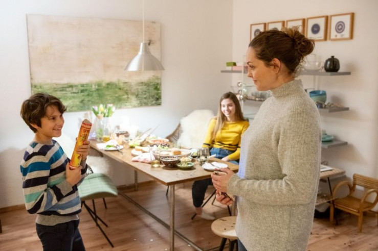 Ella (Ines Quermann, r.) genießt den Nachmittag mit ihren Kindern Linus (Talin Bartholomäus) und Lara (Emilia Eidt, M.).