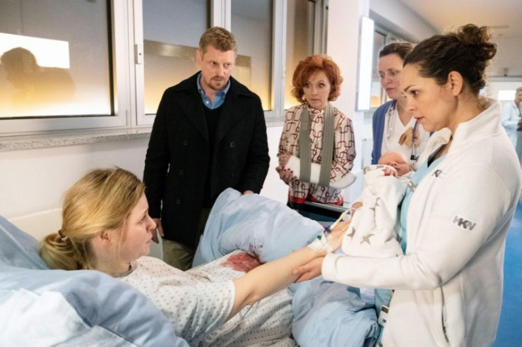 Nach der Geburt ihres Babys bekommt Louise (Katharina Küpper, liegend) plötzlich starke Unterbauchblutungen. Irene Weißenbach (Heike Trinker, 2.v.l.), ihre Hebamme (Berit Ott, 2.v.r.) und Ella (Ines Quermann, r.) machen sich große Sorgen. Zum Glück ist Gynäkologe Matthias (Martin Gruber) bereits zur Stelle.