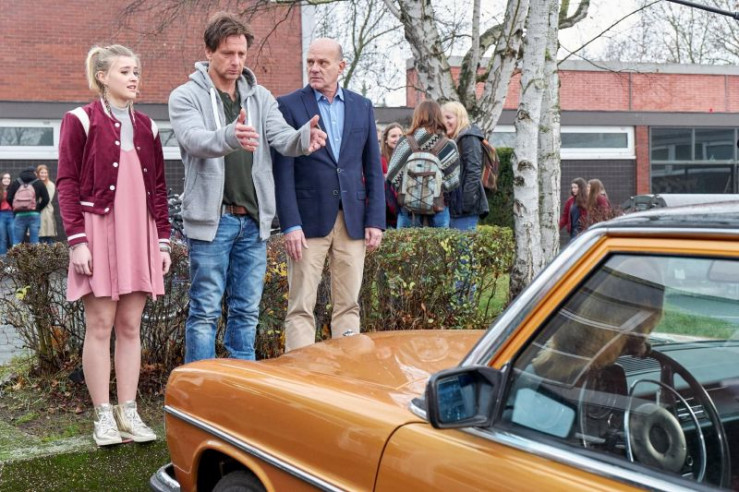 Stefan (Hendrik Duryn) sieht mit Bibi (Jeanne Goursaud) und Direktor Rose (Ulrich Gebauer, r.) einen Affen in seinem Wagen. Er hat keine Ahnung, wo er herkommt.