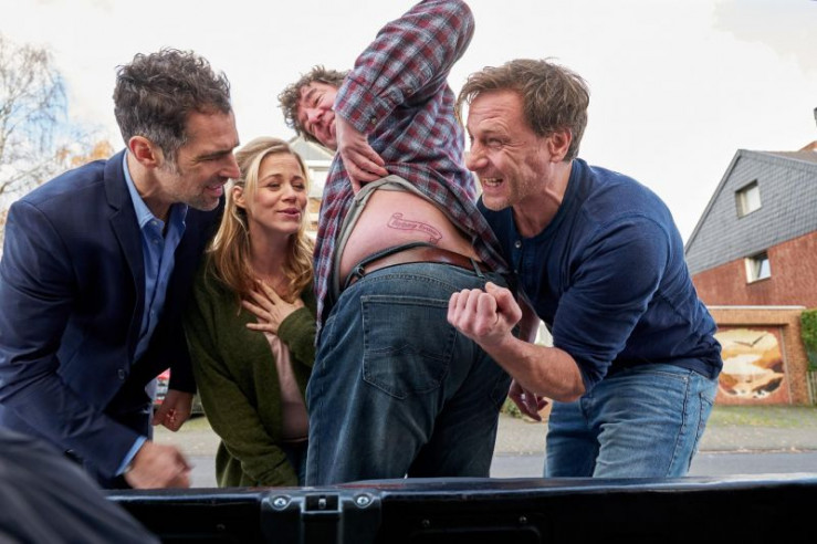 Stefan (Hendrik Duryn, r.), Karin (Jessica Ginkel) und Michael (Gabriel Merz, l.) machen an Sievers (Rainer Piwek) Po eine Entdeckung.