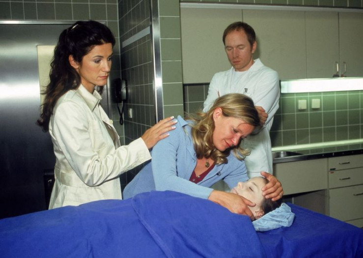 Anna Mosbach (Anna von Berg, re.vo.) will ihre bei einer Operation verstorbene Tochter ein letztes Mal sehen. Staatsanwältin Lisa Sturm (Mariella Ahrens) steht der verzweifelten Mutter bei. (hi.re. Rainer Sellien als Dr. Jansen)