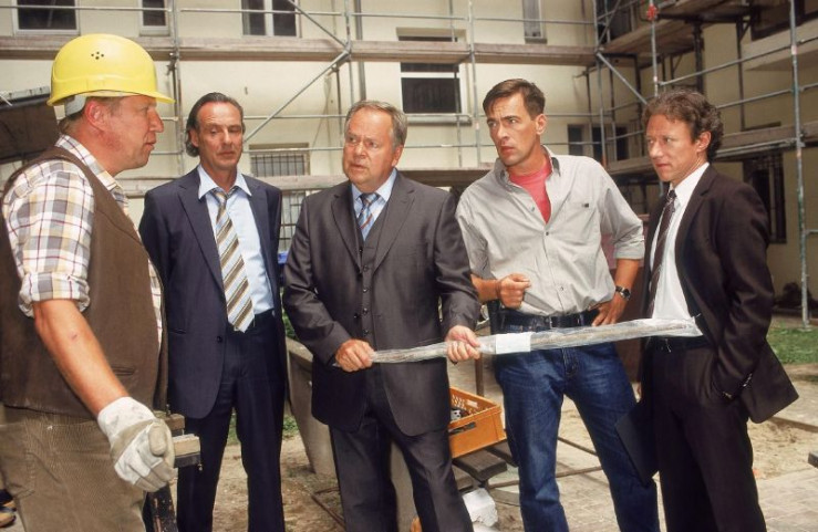 Oberstaatsanwalt Kampen (Axel Pape, re.) und die Kommissare Bonhoff (Wolfgang Krewe, 2 v.re.) und Kehler (Wolfgang Bathke) rekonstruieren mit dem Bauleiter (Hans Brückner, li.) und Prof. Neuenfels (Daniel Friedrich) den möglichen Tatablauf.