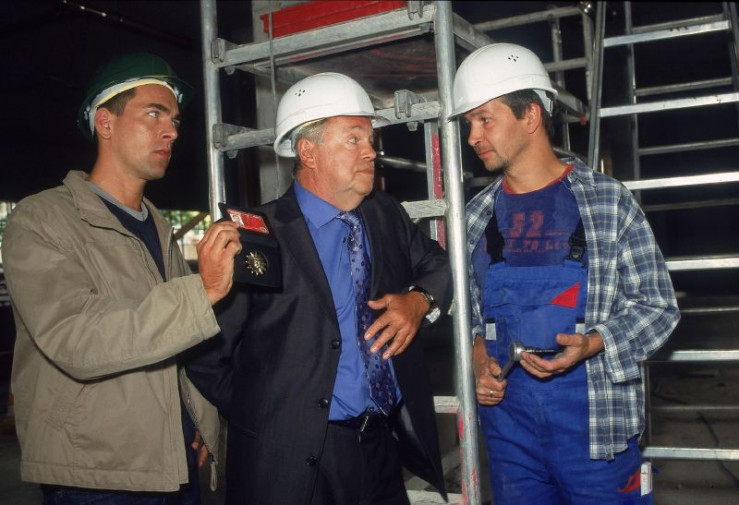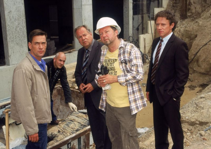 Die Ermittler (li. Wolfgang Krewe, Klaus Schindler, Wolfgang Bathke; re. Axel Pape) wollen von dem Polier (Holger Gimpel, 2.v.re.) wissen, was er beobachtet hat.
