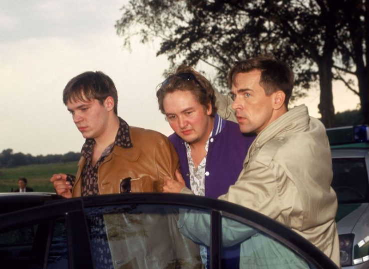 Fabian (Patrick Heinrich, l.) und Arno (Daniel Zillmann, M.) werden nach der Amokfahrt von Kommissar Bonhoff (Wolfgang Krewe) verhaftet und geben sich völlig überrascht, als man in ihrem Wagen die Leiche von Beate Perlach findet.