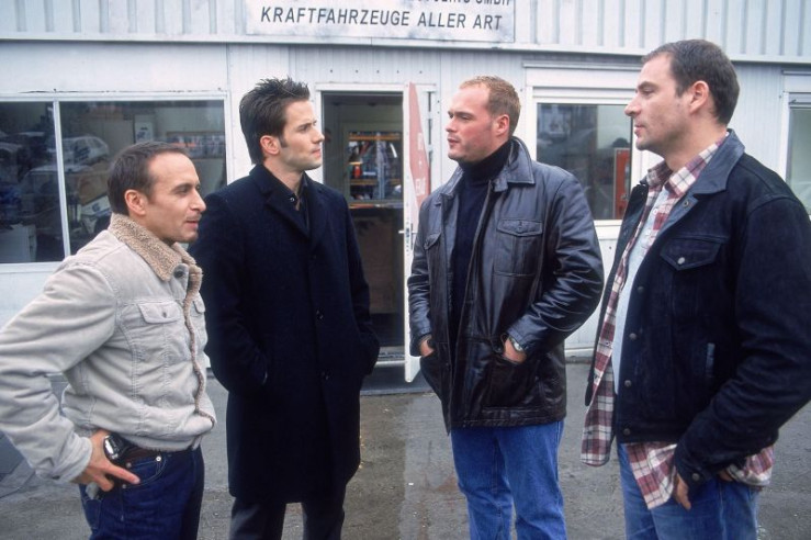 Semir (Erdogan Atalay, li.) und Jan (Christian Oliver, 2.v.li.) befragen die Schrottplatzbesitzer Ralle (Roland Pfaus, re.) und Marco (Jan Nissen). +++ Die Verwendung des sendungsbezogenen Materials ist nur mit dem Hinweis und Verlinkung auf RTL+ gestattet. +++