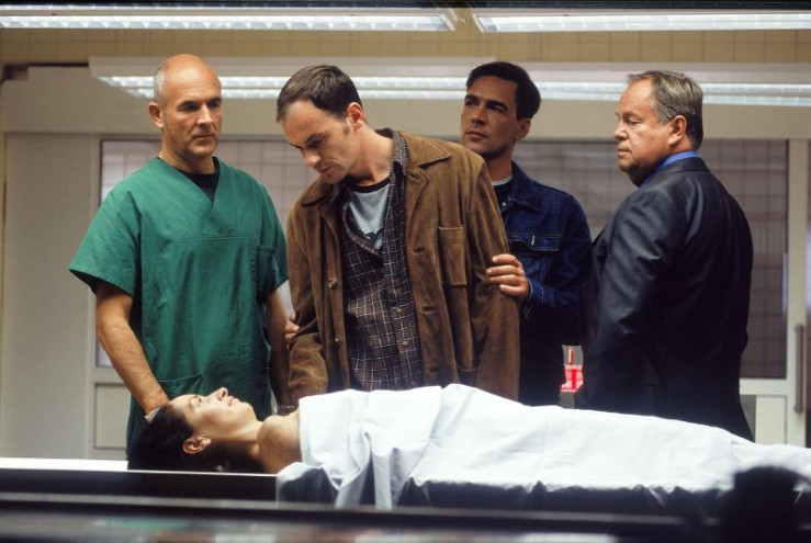 In Anwesenheit von Dr. Duhler (Klaus Schindler, l.) und den Kommissaren Bonhoff (Wolfgang Krewe, 2.v.r.) und Kehler (Wolfgang Bathke, r.) identifiziert Stefan Göllner (Anian Zollner) seine Frau Martina. Er gerät schnell in Verdacht, denn kurz vor ihrem Tod gab es einen heftigen Streit zwischen den frisch getrennten Eheleuten.