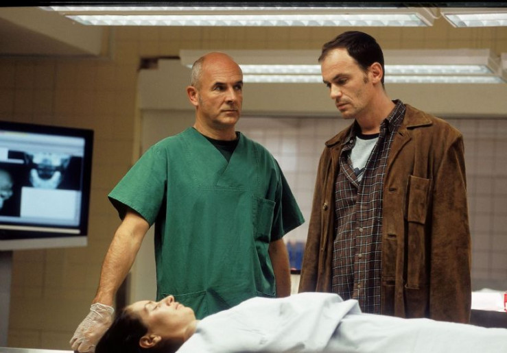 In Anwesenheit von Dr. Duhler (Klaus Schindler, l.) und den Kommissaren Bonhoff (Wolfgang Krewe, 2.v.r.) und Kehler (Wolfgang Bathke, r.) identifiziert Stefan Göllner (Anian Zollner) seine Frau Martina. Er gerät schnell in Verdacht, denn kurz vor ihrem Tod gab es einen heftigen Streit zwischen den frisch getrennten Eheleuten.