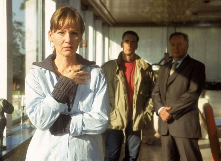 Die Beamten Bonhoff (Wolfgang Krewe, Mi.) und Kehler (Wolfgang Bathke) befragen Vera Thieme (Antje Schmidt) über ihre finanzielle Situation. Warum wurde ihr Mann umgebracht?