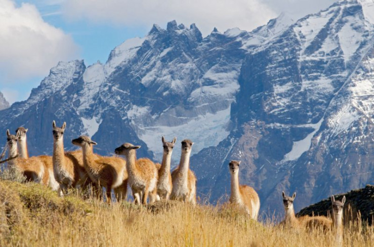 Das Bild zeigt Herden von Guanakos, die wilden Vorfahren der Lamas, durchstreifen das Hügelvorland der Anden. Die Temperaturen sinken hier regelmäßig unter 0°C, aber ihr doppelschichtiges Fell hält sie auch bei extremer Kälte warm.