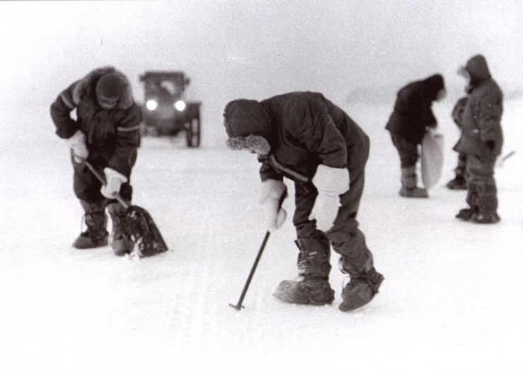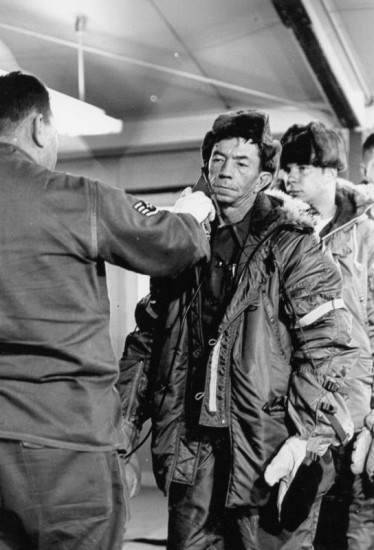 Einsatzkräfte, die nach verlorenen Atombomben auf kontaminiertem Gelände suchen, werden mit einem Geigerzähler kontrolliert.