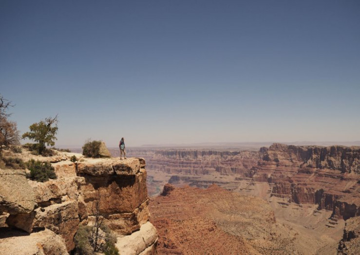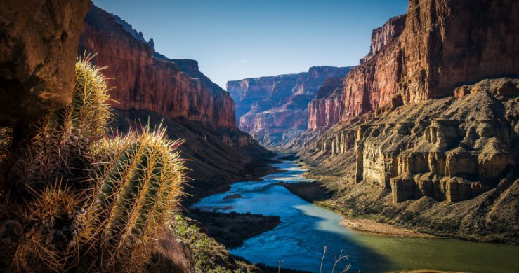 Eine Aufnahme des Grand Canyon; im Vordergrund ein Kaktus.
