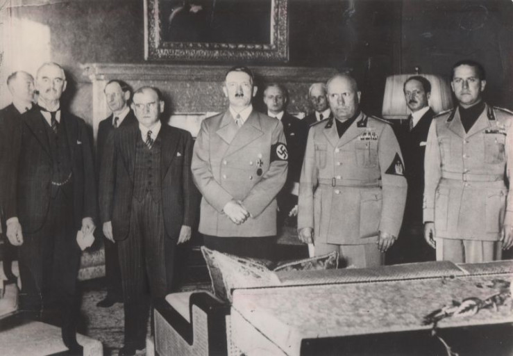 1938: Münchner Abkommen, Premier Neville Chamberlain im Gespräch mit Mussolini.