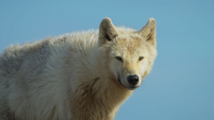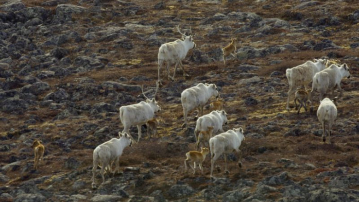 Ein weißer Arktischer Wolf jagt Karibus in der Tundra Kanadas. Die Herden passieren das Revier des Wolfes nur wenige Wochen im Jahr. So hat er nur wenig Zeit, um die Versorgung seines Nachwuchses sicherzustellen.