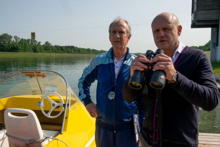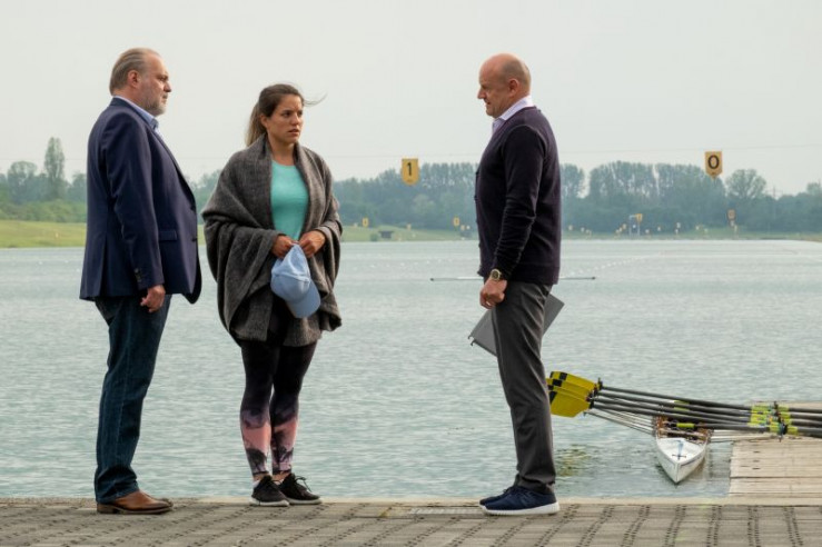 Der tödliche Zusammenbruch einer jungen Frau beim Ruder-Training führt Hauptkommissar Richard Voss (Jan-Gregor Kremp, r.) und sein Team Annabell Lorenz (Stephanie Stumph, l.), Dr. Sommerfeld (Christina Rainer, 2.v.l.), Tom Kupfer (Ludwig Blochberger, 2.v.r.) schnell in die vom Erfolg getriebene Welt des Leistungssportes.