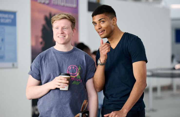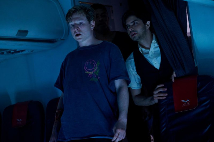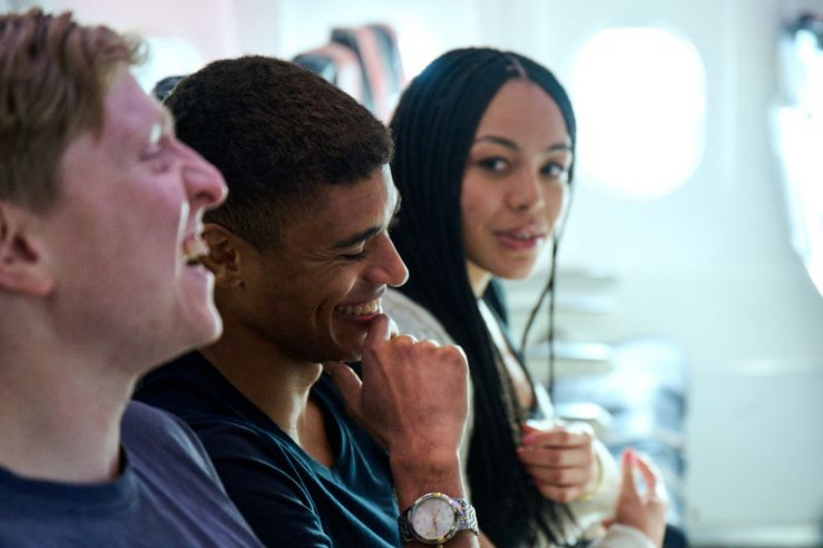 Kyle (Will Attenborough, l.) und Jed (Jeremias Amoore, M.) machen sich über den Flugbegleiter lustig, was Ava (Sophie McIntosh, r.) überhaupt nicht gefällt.