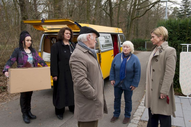 Die beiden Künstlerinnen Gundula Krause (Tatjana Clasing, l.) und Pia Sander (Sabine Orléans) beobachten das Geschehen auf dem Nachbargrundstück.