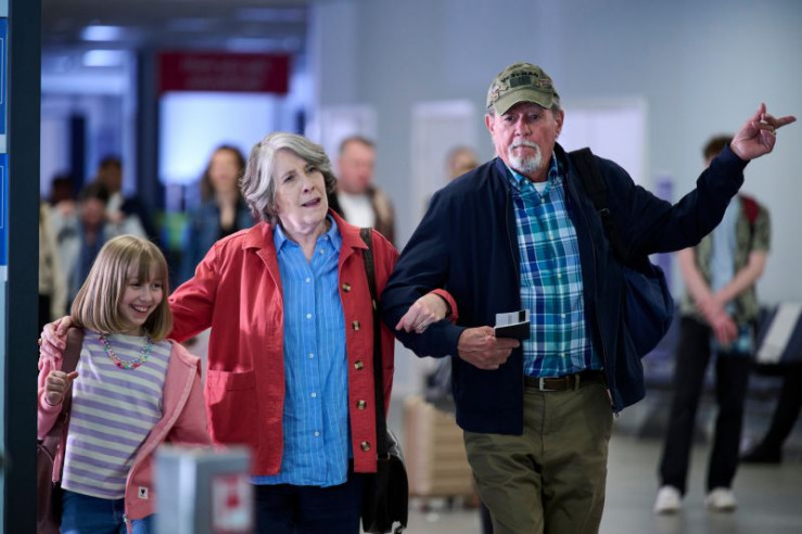 Rosa (Grace Nettle, l.) freut sich auf den Urlaub mit ihren Großeltern Mardy (Phyllis Logan, M.) und Hank (James Carroll Jordan, r.).