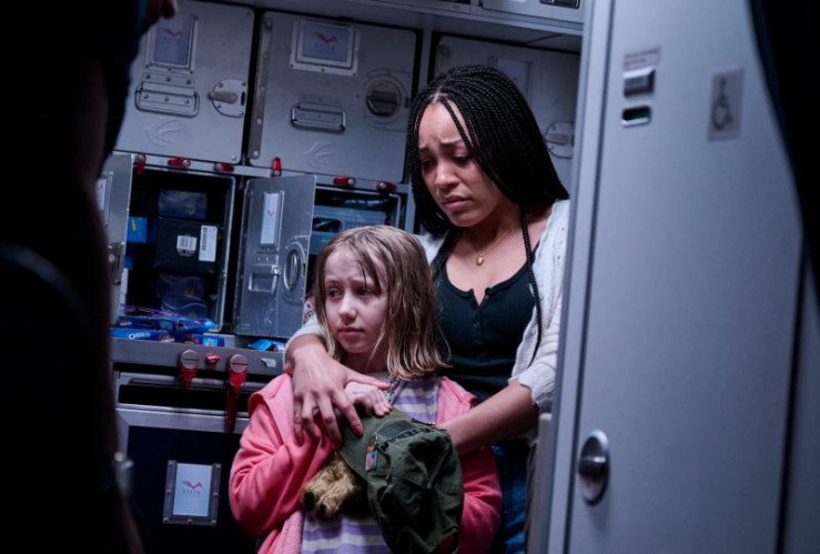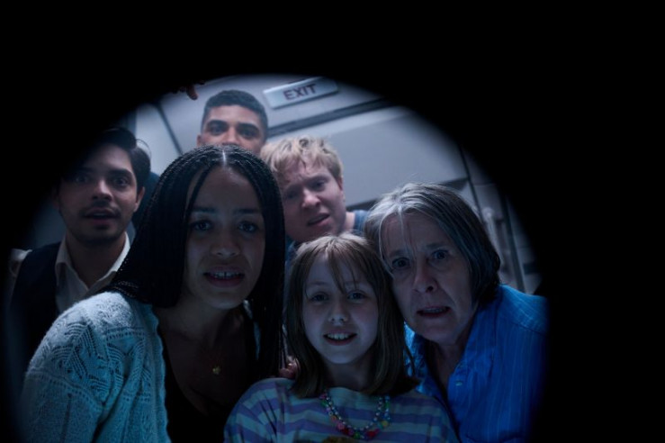 Kyle (Will Attenborough, l.) und Jed (Jeremias Amoore, M.) machen sich über den Flugbegleiter lustig, was Ava (Sophie McIntosh, r.) überhaupt nicht gefällt.