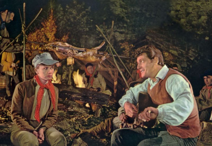Der Räuberhauptmann (Carlos Thompson, links) beobachtet schmunzelnd, wie couragiert sich sein Bursche (Liselotte Pulver als Comtesse Franziska) gebärdet. Er ahnt längst, dass sich hinter dem jungen Mann eine Frau versteckt.