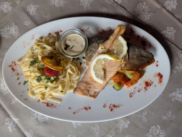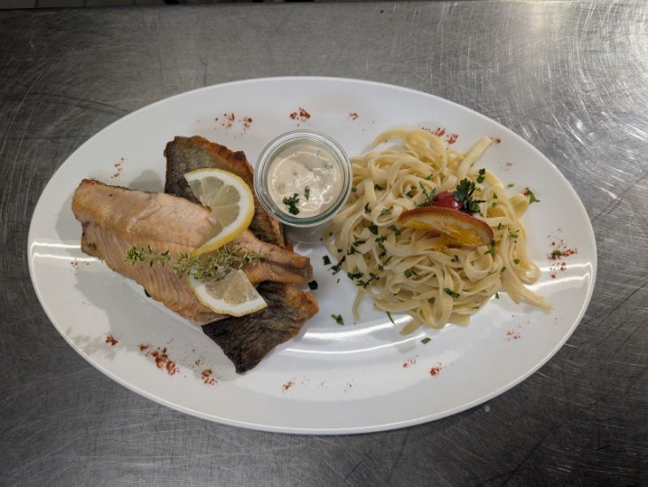 Saiblingsfilet auf Tagliatelle mit Gemüse und Zitronensauce à Part vom Gasthof Hofwirt in Neubeuern.
