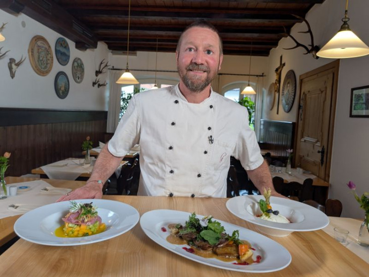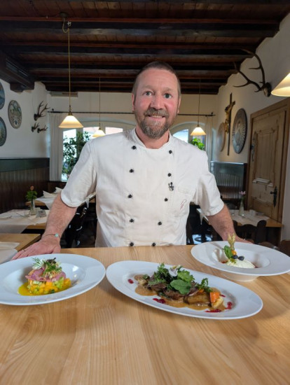Wirt Christoph Gelder von der Schlosswirtschaft Wildenwart stellt sein 3 Gang-Menü vor.