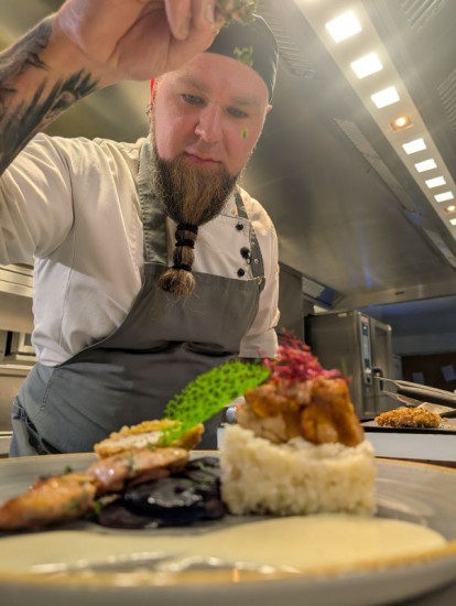 Koch Michael Muhler vom Weßner Hof bereitet die Hauptspeise vor: 3erlei vom Weßner Hof Hendl, mit Limettensahne, Urkarotten und Weißweinrisotto.