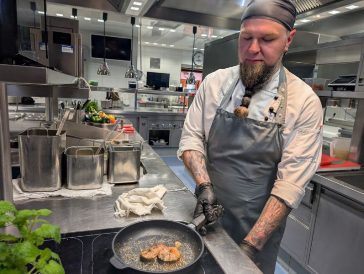 Wirt Christoph Gelder von der Schlosswirtschaft Wildenwart bereitet die Hauptspeise zu: Rehschnitzel aus heimischer Jagd mit Wachholderrahmsauce auf Spargelgröstl und mariniertem Wildkräutersalat.