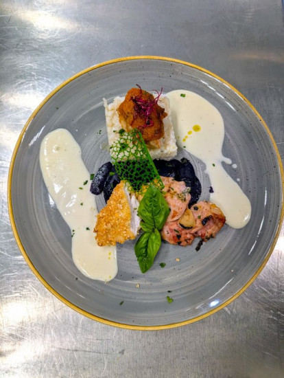 Die Hauptspeise vom Weßner Hof: 3erlei vom Weßner Hof Hendl, mit Limettensahne, Urkarotten und Weißweinrisotto.