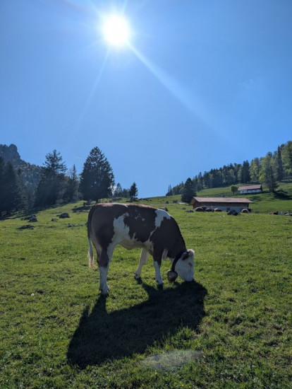 Eine grasende Kuh auf der Chiemgauer Hochplatte.