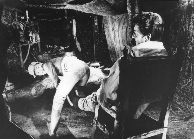 Der Räuberhauptmann (Carlos Thompson, links) beobachtet schmunzelnd, wie couragiert sich sein Bursche (Liselotte Pulver als Comtesse Franziska) gebärdet. Er ahnt längst, dass sich hinter dem jungen Mann eine Frau versteckt.