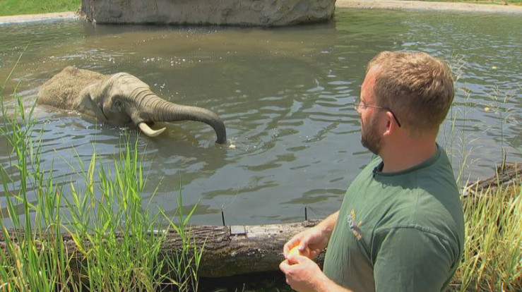 Badetag für Elefantenbulle Tamo im Kronberger Opel-Zoo. An diesem Tag ist es besonders heiß und der verspielte Tamo liebt das Planschen im Tümpel sehr. Blöd nur, dass die alten Elefantendamen Aruba und Zimba extrem missgünstig sind und Tamo nicht das kleinste Vergnügen gönnen. Deshalb heißt es für die Pfleger: geschickt ablenken.