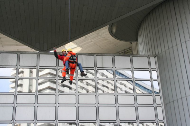 Willi (links) mit dem Höhenretter Berni von der Berufsfeuerwehr München am Hypobankgebäude in München.