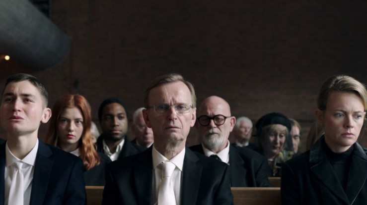 Sten (Johan Ulveson, Mitte) mit seinen Kindern Aron (Gustav Lindh, vorne li.) und Clara (Josephine Bornebusch, vorne re.) in Trauer.