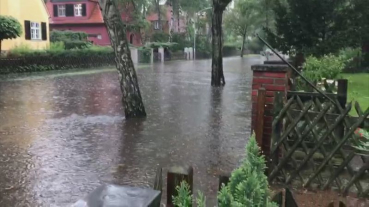 Katastrophenwinter, Jahrhundertregen, Hitzerekord - immer wieder halten unglaubliche Wetterphänomene Berlin in Atem. Die Meteorologen Dr. Katja Horneffer und Donald Bäcker sowie Prominente wie Claudia Schmutzler und Jaecki Schwarz blicken auf die spektakulärsten Wetterereignisse der vergangenen Jahrzehnte. - Hochwasser auf Berliner Straßen.