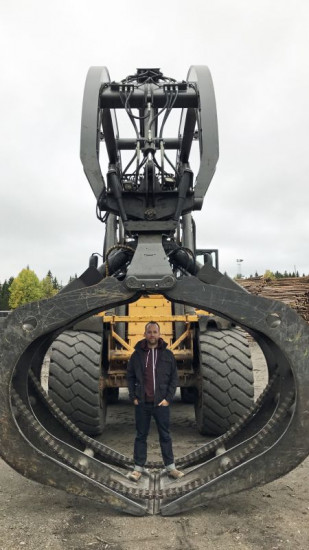 Mit menschengroßen Greifern werden die Rundhölzer auf die Züge geladen.