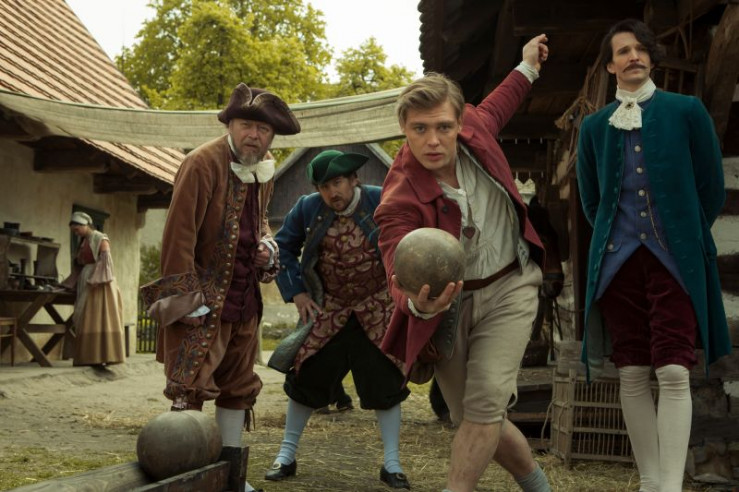 Beim Kegeln lässt sich eine Menge Geld verspielen. Auch Erik (David Schütter, 2.v.r.) und Rübezahl als Kaufmann (Sabin Tambrea, r.) versuchen sich darin.