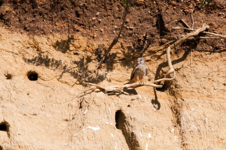 Turmfalke vor Lehmwand.