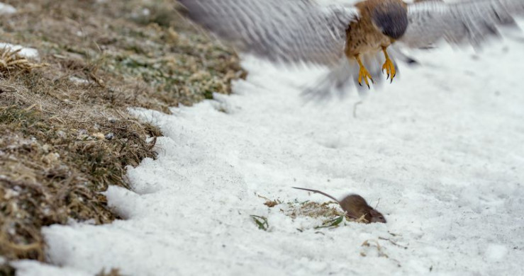 Turmfalke auf der Jagd nach einer Maus.