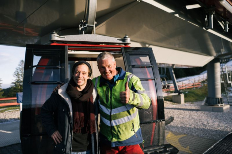 Bei der Alpspitzbahn in Nesselwang erfährt er, wie eine Seilbahn angetrieben und in den Stationen wieder abgebremst wird. Außerdem hilft er Betriebsleiter Lukas bei der Wartung der Seilbahn. Mit Klettergurt und Helm gesichert überprüfen sie in 12 Metern Höhe die Rollen der Seilbahn.